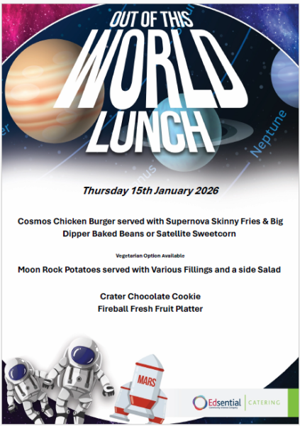 On Thursday 15th January we have a special menu change for Census Day. The kitchen will be serving chicken burgers and fries followed by a chocolate cookie or fresh fruit. Jacket potatoes will also be available.